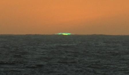 La luz verde es un fenómeno físico raro que se puede observar junto al mar al atardecer o al amanecer. La atmósfera es un prisma gigante que descompone la luz blanca del sol, pero también absorbe la violeta y el azul. En la parte superior del disco solar, hay un borde verde. Cuando el disco solar está completamente oscurecido por el horizonte, vemos verde: es luz verde. A medida que la Tierra gira, ¡la luz verde dura solo uno o dos segundos!